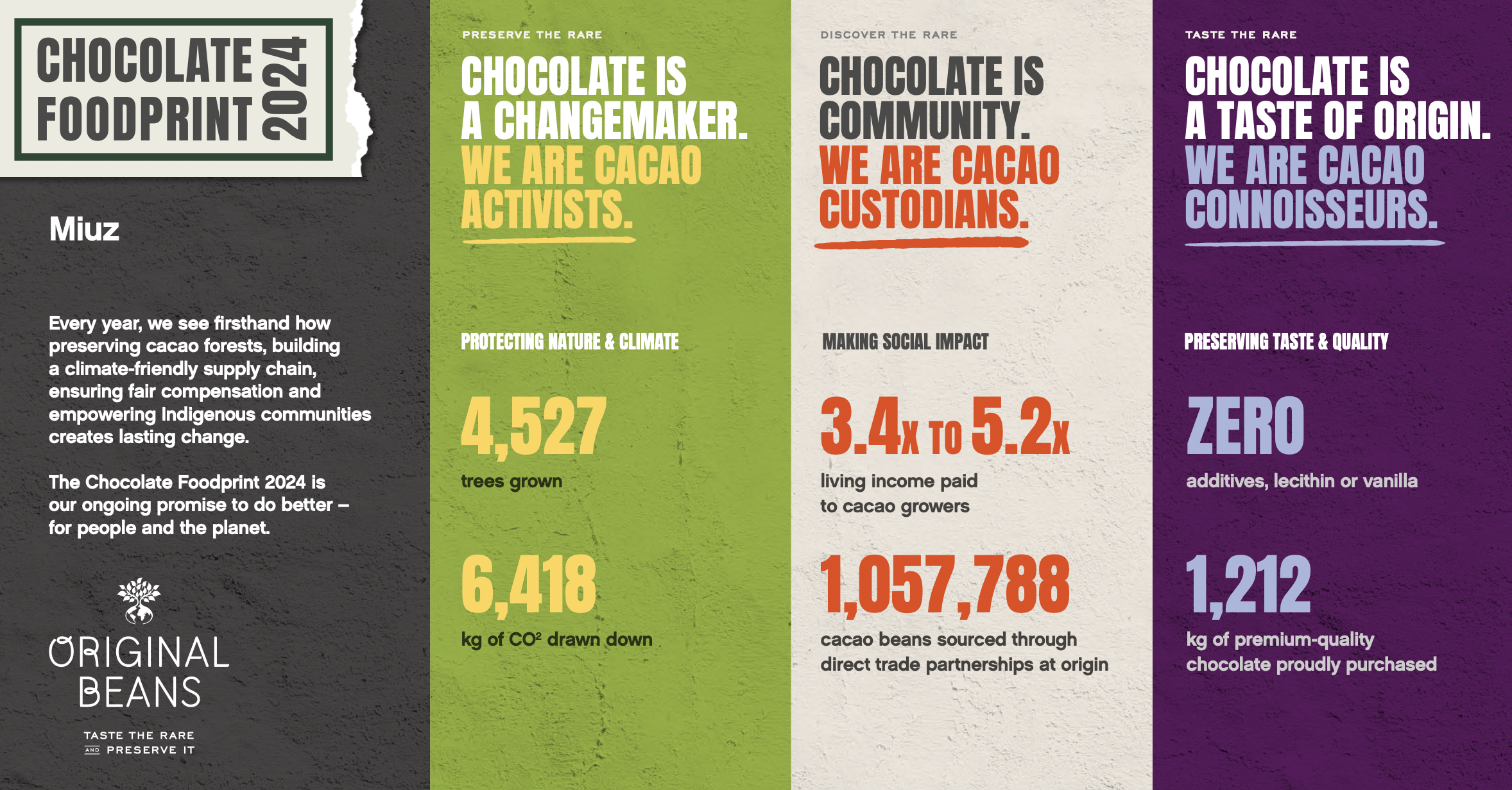 In 2024 alone, our collaboration has helped plant over 4,500 trees, draw down more than 6,400 kg of CO₂, and increase farmers’ incomes from 3.4x to 5.2x. And that’s just the beginning. Want to see the full impact? Take a look at our Chocolate Footprint on the left.